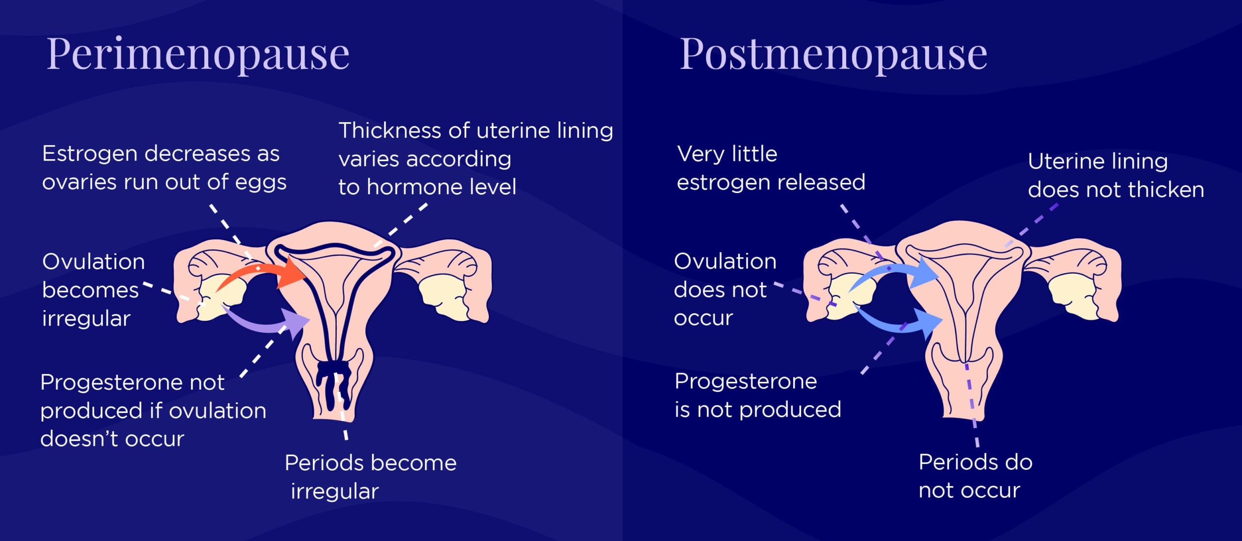 Pre-menopause, FSH (follicle-stimulating hormone) and LH (luteinizing hormone) work together to produce a period. FSH causes eggs to mature in the ovaries, then LH triggers the egg’s release. During perimenopause, FSH levels fluctuate significantly, which means things get out of whack.